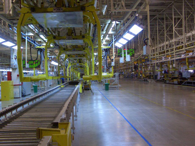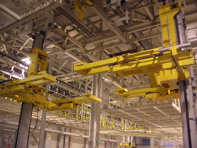 此項目總包方為日本大福,全線采用摩擦驅(qū)動?罩袃Υ婢和地面生產(chǎn)線采用斜坡鏈條銜接,車輛上下線為平臺升降機。生產(chǎn)工位高度變化要求通過走行軌的起伏變化實現(xiàn)。整個總裝的工藝布局與上汽臨港工廠基本類似。
